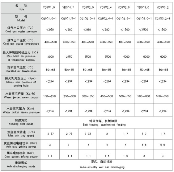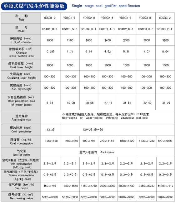 單段式煤氣發(fā)生爐技術(shù)參數(shù)